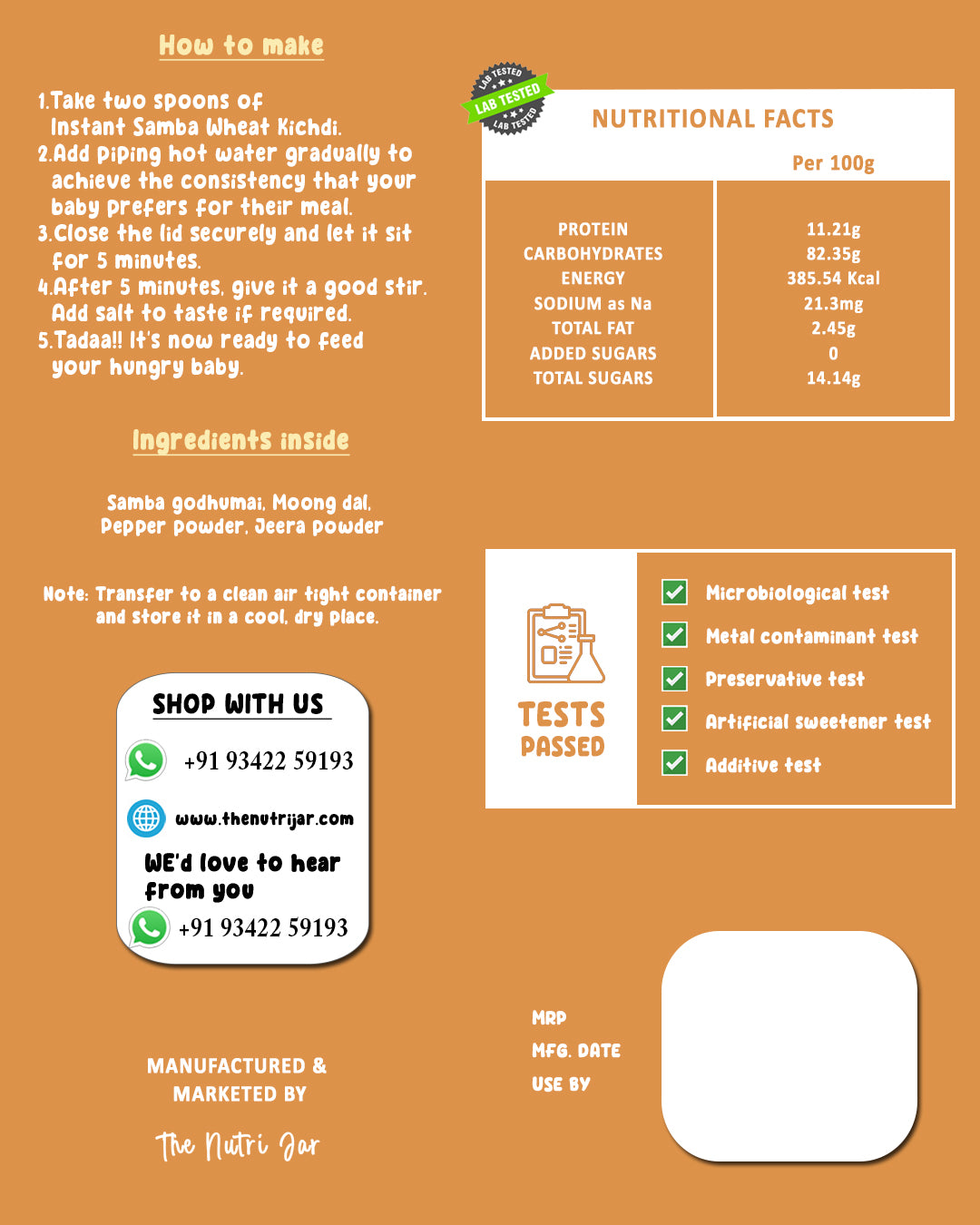 Introducing our nutritious and flavorful Samba Godhumai Kichdi, thoughtfully created with your baby's health and happiness in mind! Made with wholesome ingredients, this kichdi offers a delightful blend of taste and nutrition, perfect for introducing your little one to a world of delicious and nourishing foods.